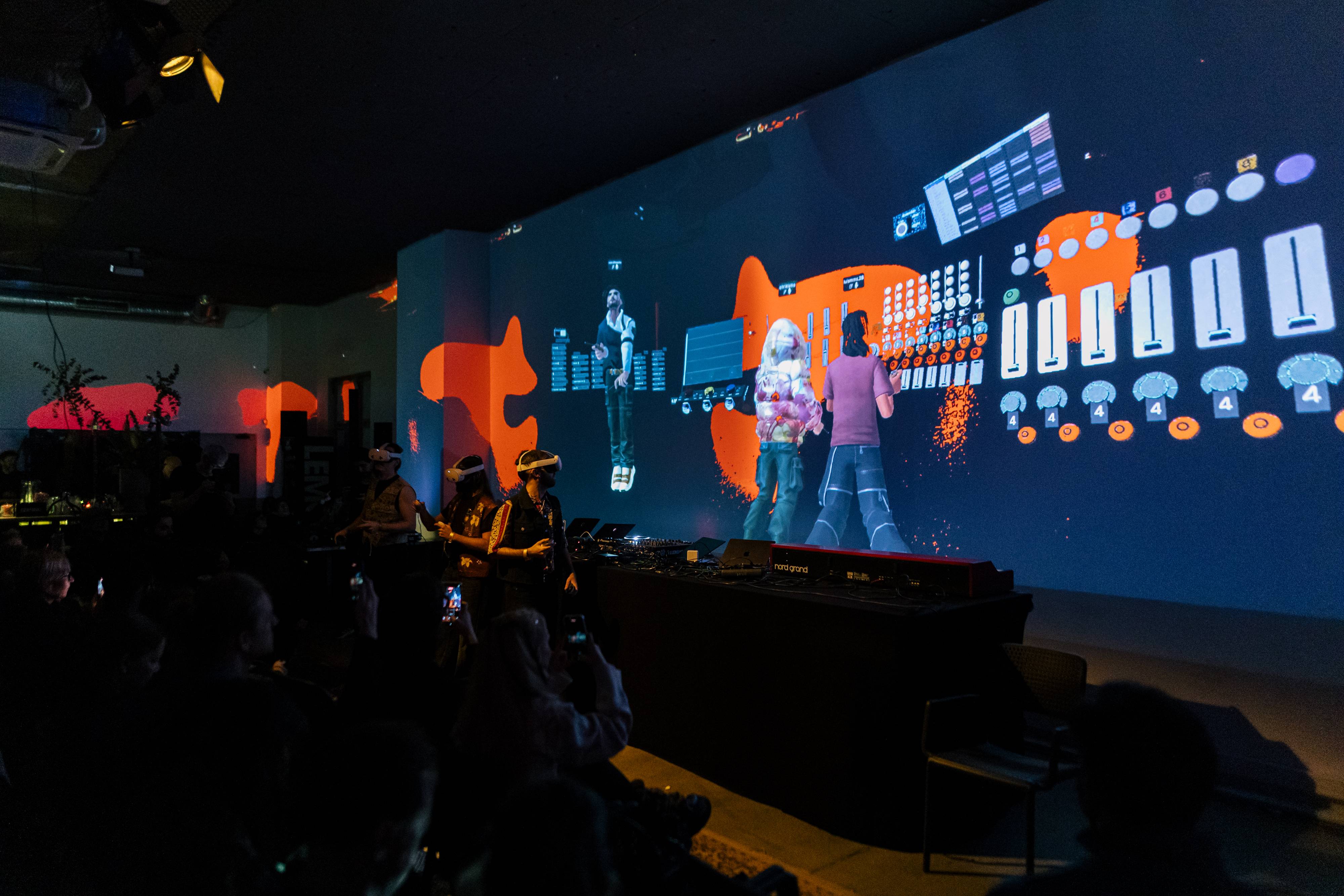 ALHAJA: There’s definitely a shift. Wearing a headset means you lose direct eye contact with the audience, but you gain something else. Inside the virtual space, there’s a different kind of intimacy between performers. We’re sharing a dimension that the audience can witness on screen, even if they’re not inside it themselves. The audience experiences a dual reality: the physical performance on stage, and the virtual world being shaped live.