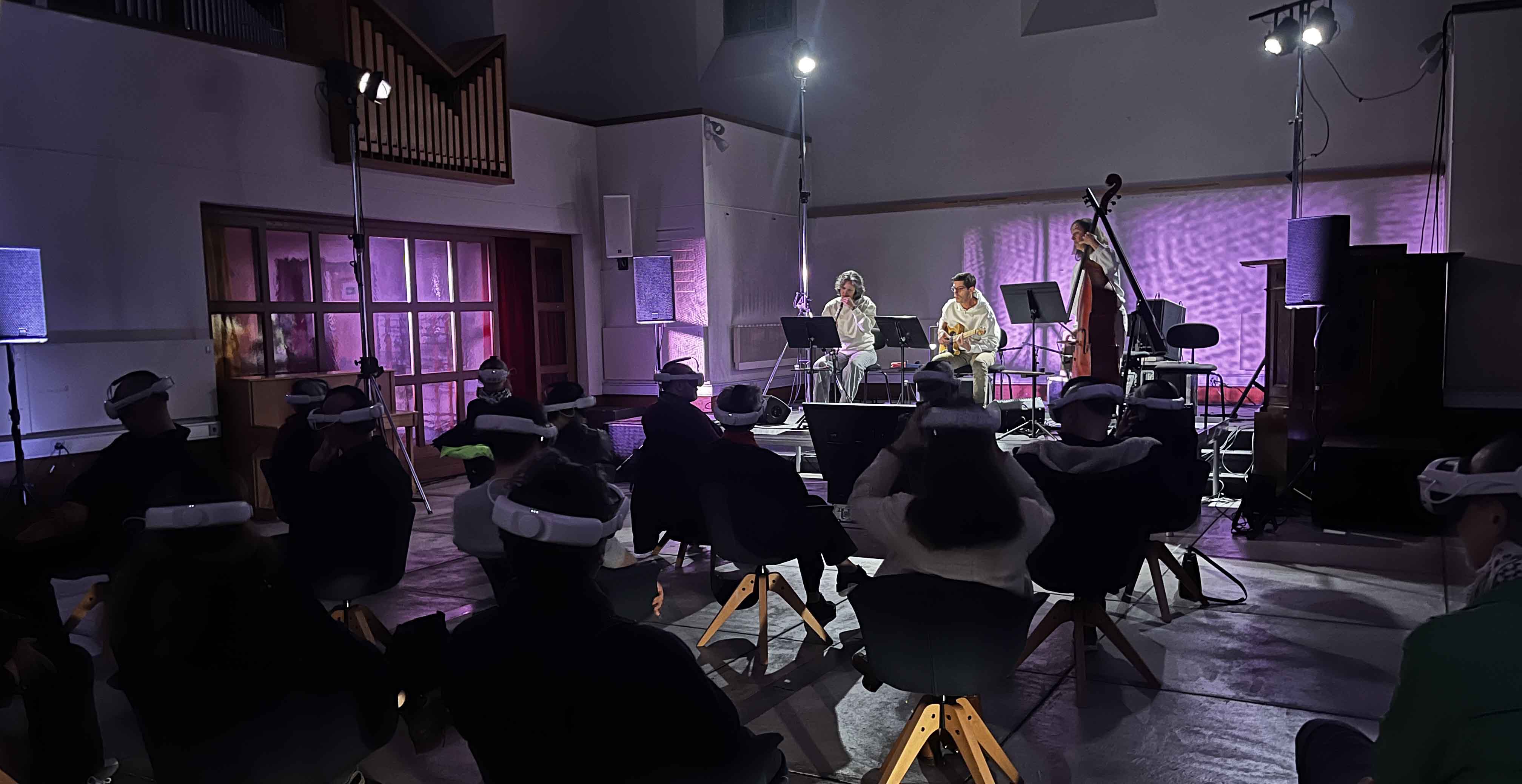 For each session at GIFF, about fifteen audience members will enter the experience simultaneously, wearing VR headsets while surrounded by Contrechamps performers playing live. The result is a hybrid concert where real and virtual coexist: listeners can no longer distinguish what comes from physical space and what resonates from the virtual realm.