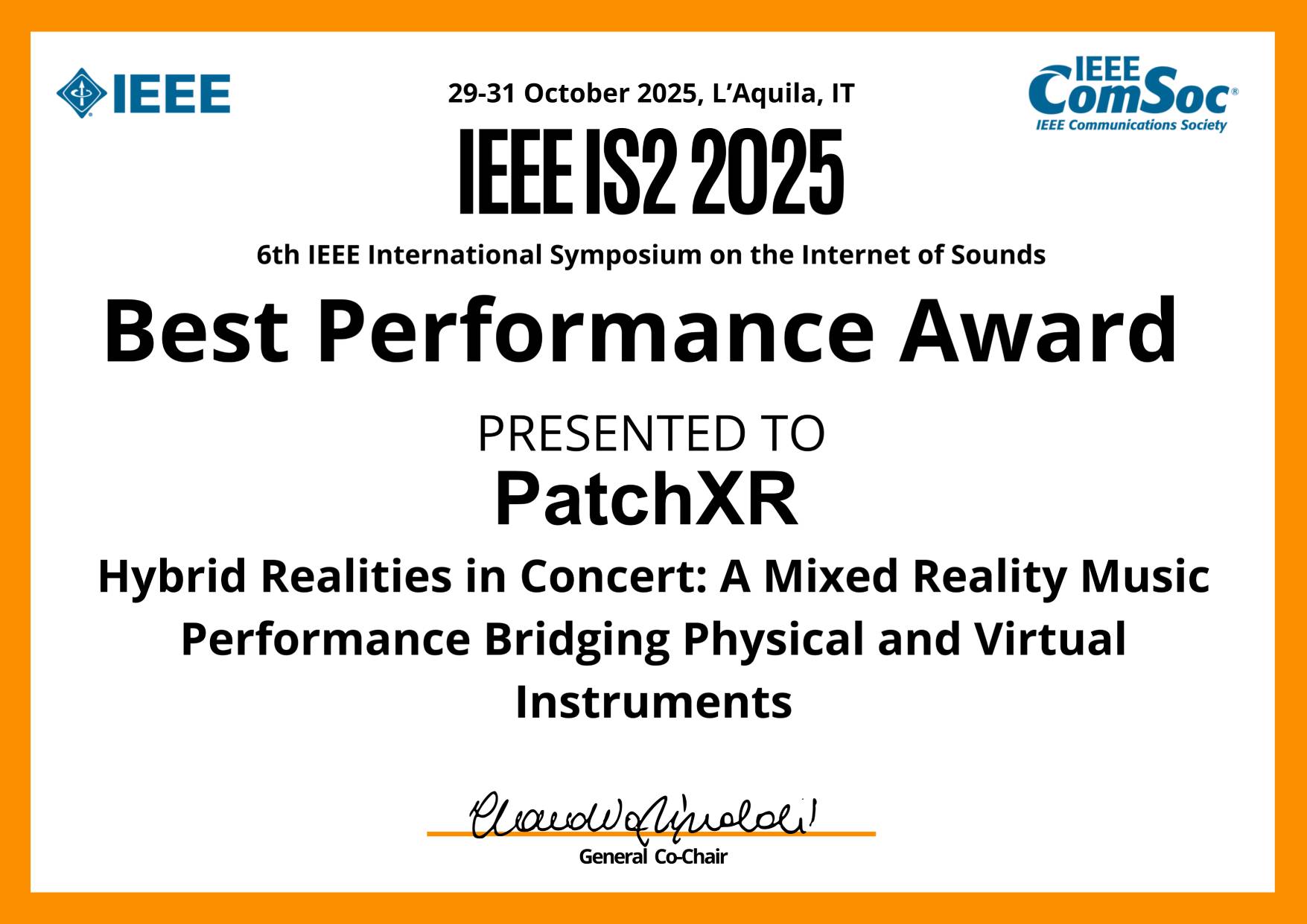 We’re proud to share that PatchXR received the Best Performance Award at the IEEE International Symposium on the Internet of Sounds (IS² 2025) for Hybrid Realities in Concert: Bridging Physical and Virtual Instruments.